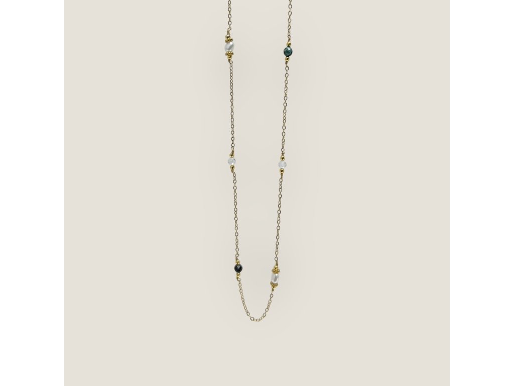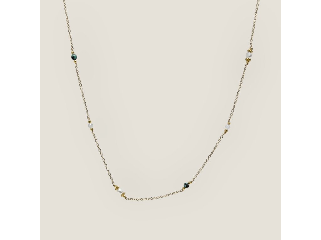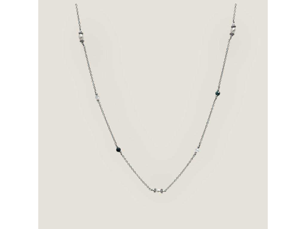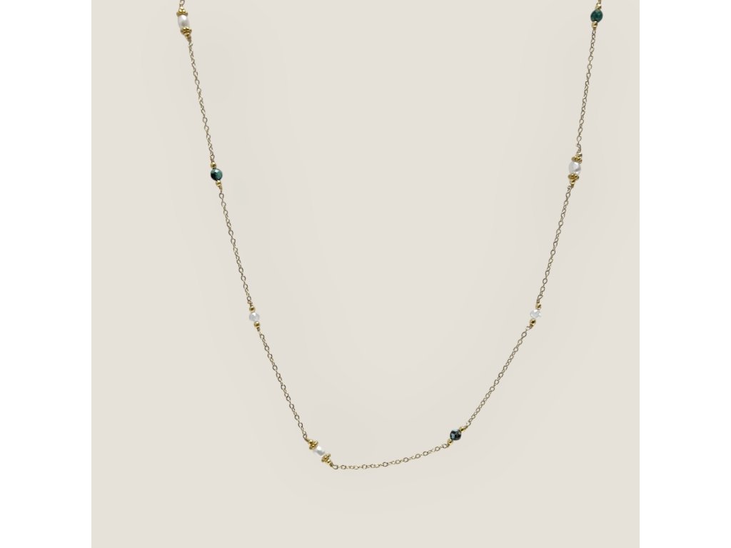 Spojuje tři výjimečné prvky – říční perly symbolizující čistotu, africký tyrkys přinášející klid a rovnováhu a čirý zirkon, který dodává jemný, luxusní třpyt.