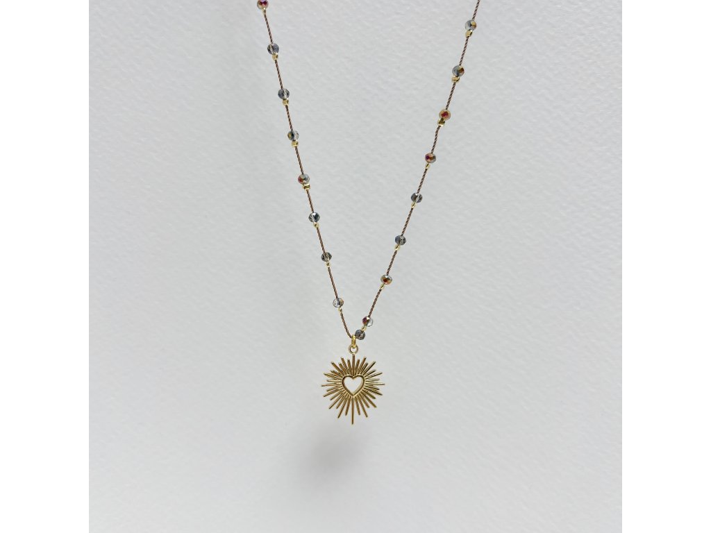 Heart Rays Silk – náhrdelník z krouceného hedvábí s korálky a srdcem s paprsky (pozlacený)