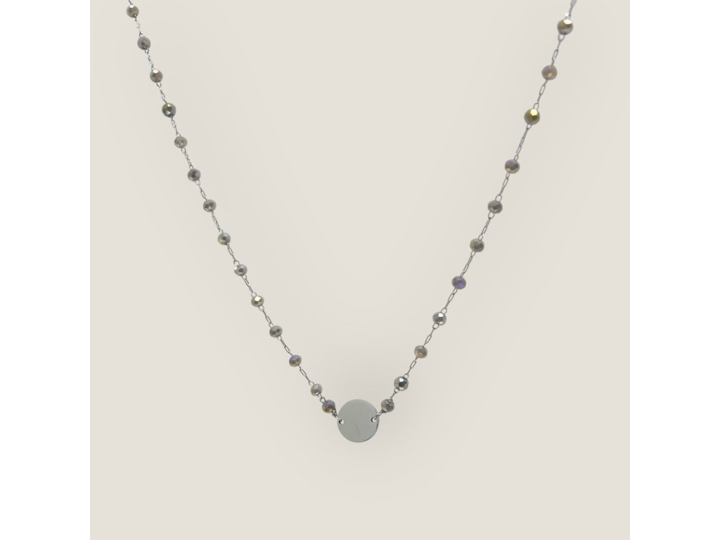 Karma O – náhrdelník s broušenými šedými korálky s duhovým pokovem a kruhem z chirurgické oceli