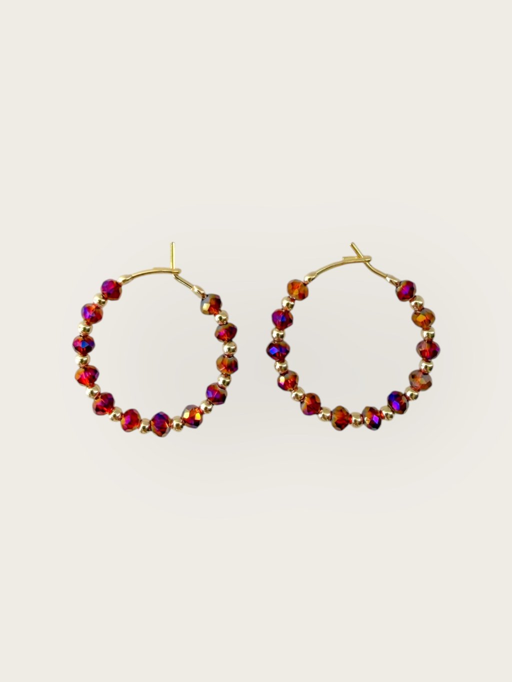 Tyto minimalistické kruhové náušnice vznikly pro ženy, které milují jemné šperky s neobyčejným detailem. Kombinace broušených skleněných korálků v odstínu Rainbow metal a drobných gold filled korálků vytváří elegantní hru světla, která se mění s každým pohybem.