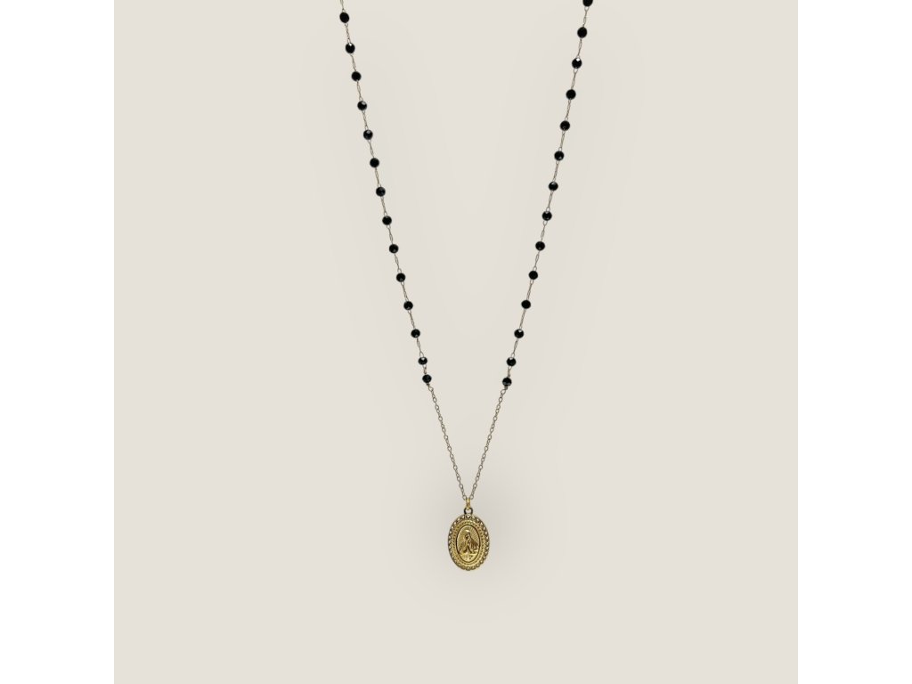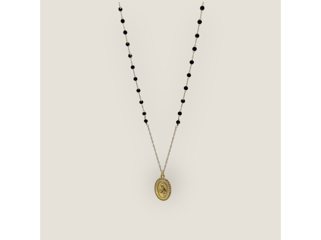 Madonka Black – náhrdelník s černými broušenými korálky a pozlaceným přívěskem Madonky