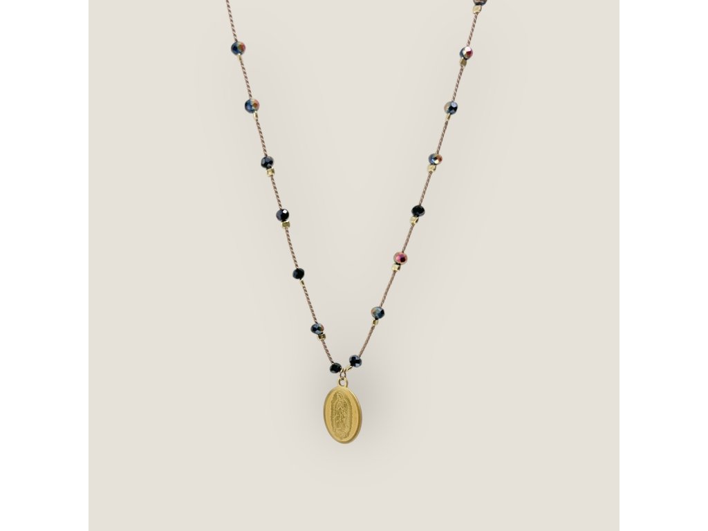 Dominantou náhrdelníku je přívěsek Madonky z chirurgické oceli, který symbolizuje ochranu, víru a ženskou sílu.
