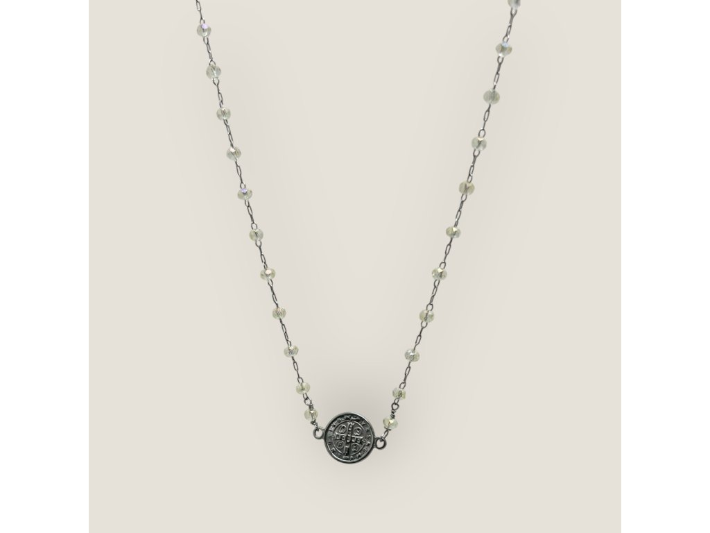 Tento minimalistický náhrdelník z kvalitní chirurgické oceli zdobí mince sv. Benedikta, jednoho z nejznámějších křesťanských symbolů ochrany před zlem.
