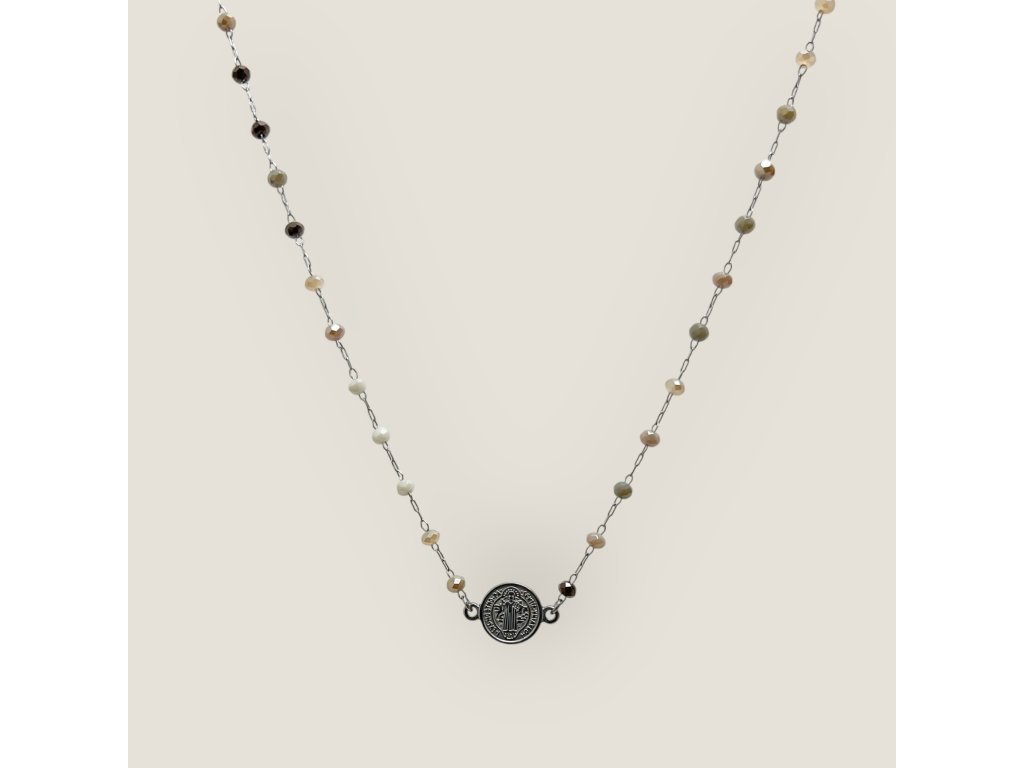 Tento minimalistický náhrdelník z kvalitní chirurgické oceli zdobí mince sv. Benedikta, jednoho z nejznámějších křesťanských symbolů ochrany před zlem.