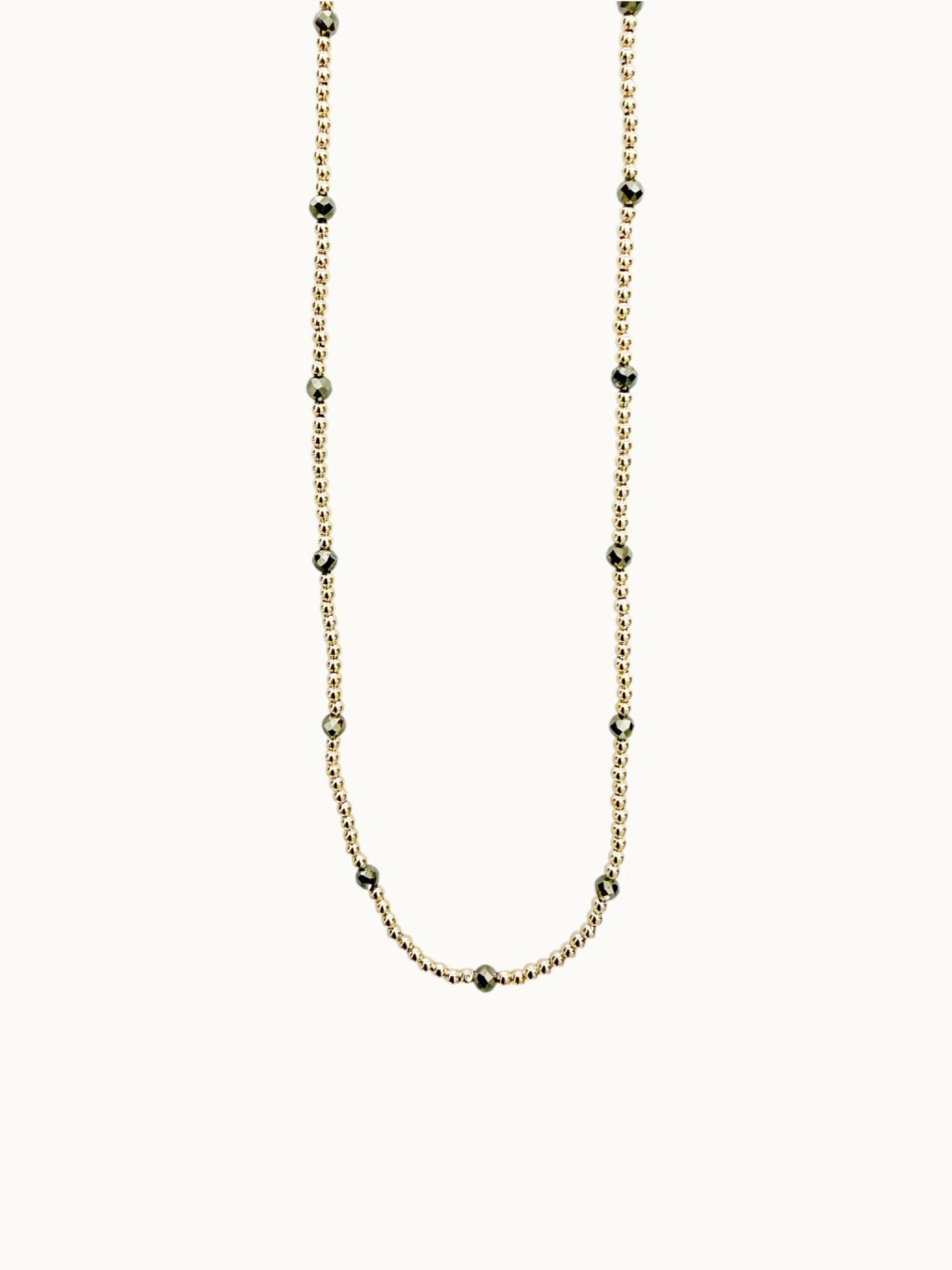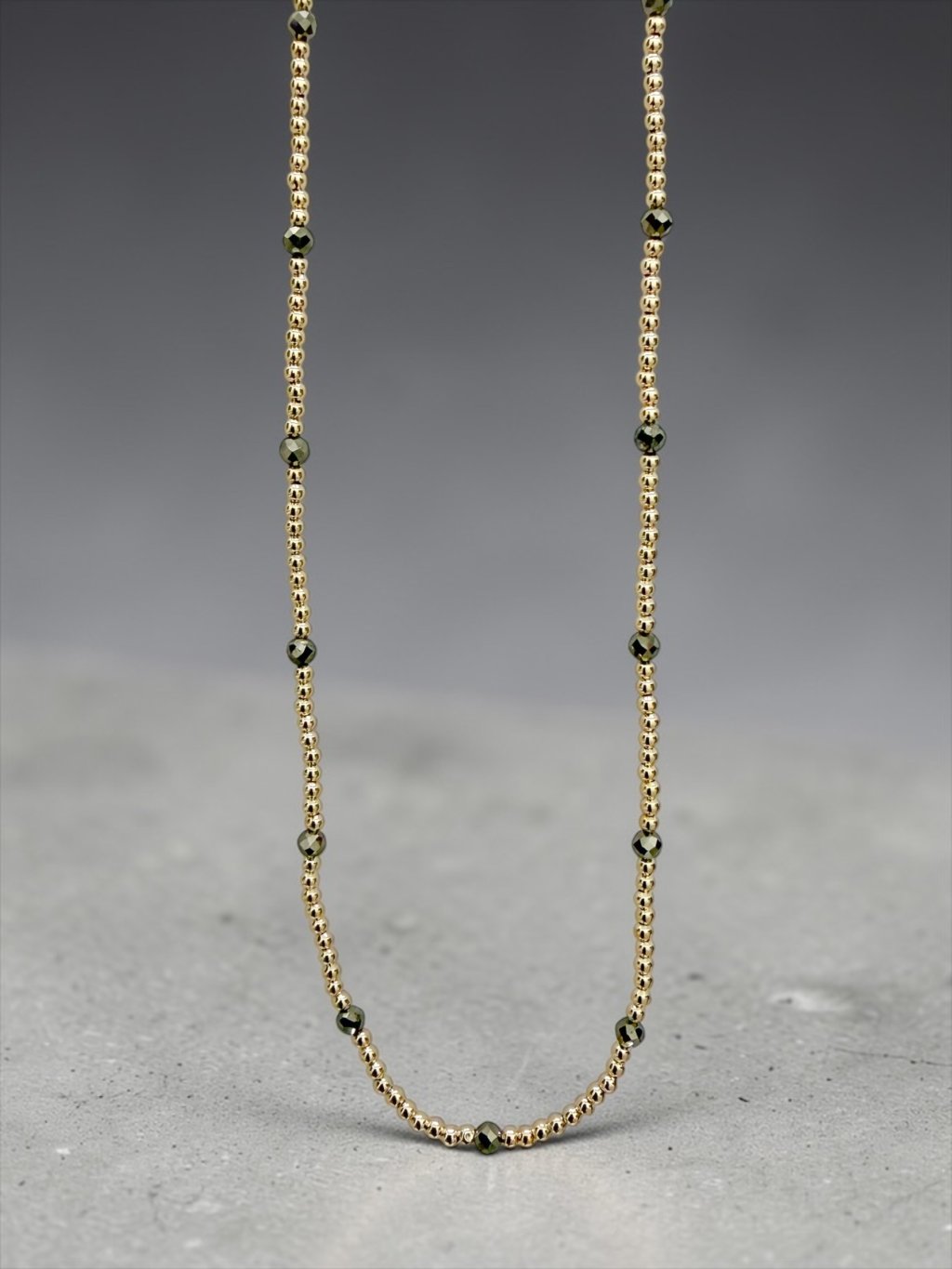 Náhrdelník je ručně vyráběn v dílně PERLINA z kvalitních korálků gold filled a doplněn korálky z přírodního pyritu. Materiál gold filled je známý svou vysokou odolností a dlouhou životností. Díky silné vrstvě zlata si šperk zachovává svůj krásný vzhled výrazně déle než běžně pozlacené šperky.
