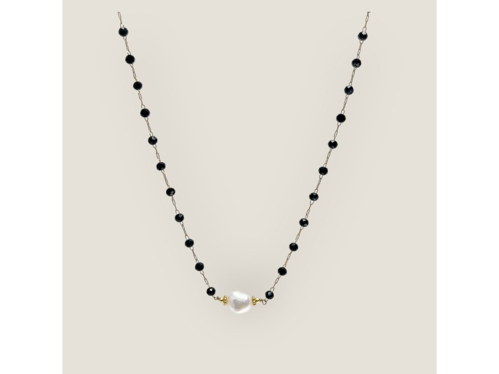 Perla je umístěna mezi černými broušenými korálky , jejichž jemné odlesky vytvářejí harmonický kontrast.Náhrdelník je vyroben z pozlacené chirurgické oceli, která zaručuje odolnost, barevnou stálost a luxusní vzhled po dlouhá léta.