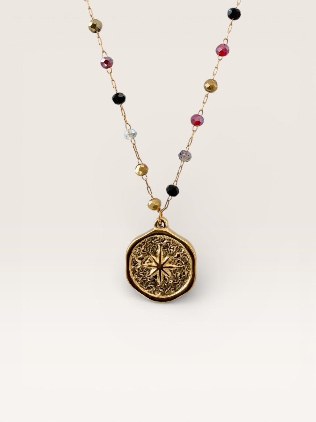 Minimalistický náhrdelník Coin Aurea Solara Burgundy Mix spojuje elegantní kruhový přívěsek s jemnými broušenými korálky v odstínech Burgundy. Zlacená chirurgická ocel dodává šperku nadčasový vzhled a luxusní charakter.