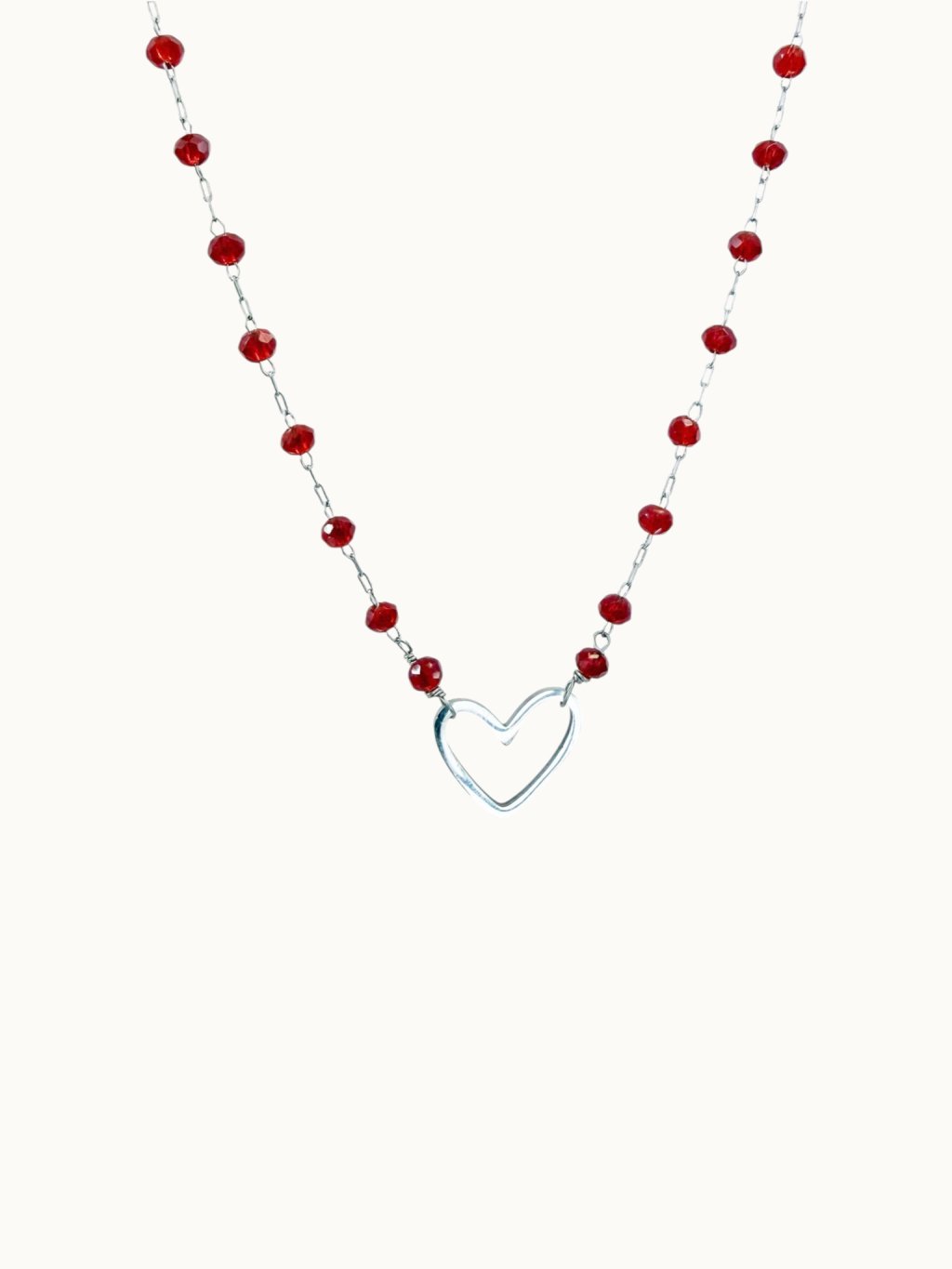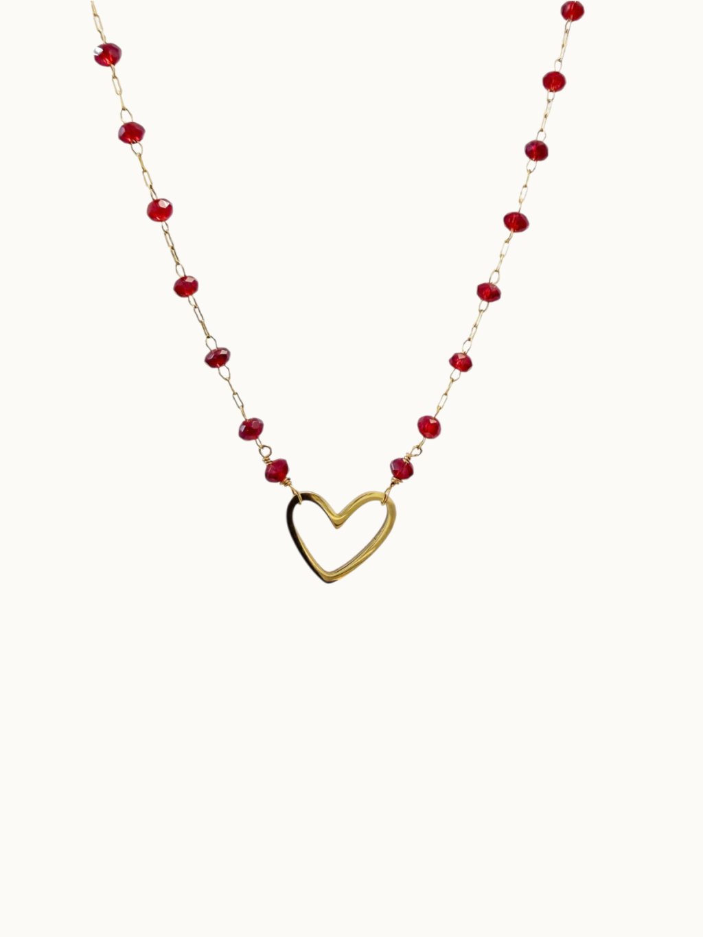 Náhrdelník Heart Ruby je jemný šperk, který spojuje symboliku srdce s výrazným barevným detailem. Broušené korálky v odstínu Ruby dodávají náhrdelníku elegantní hloubku a ženský charakter.