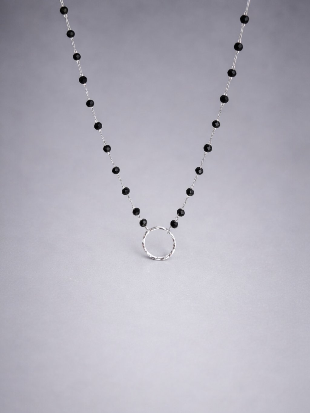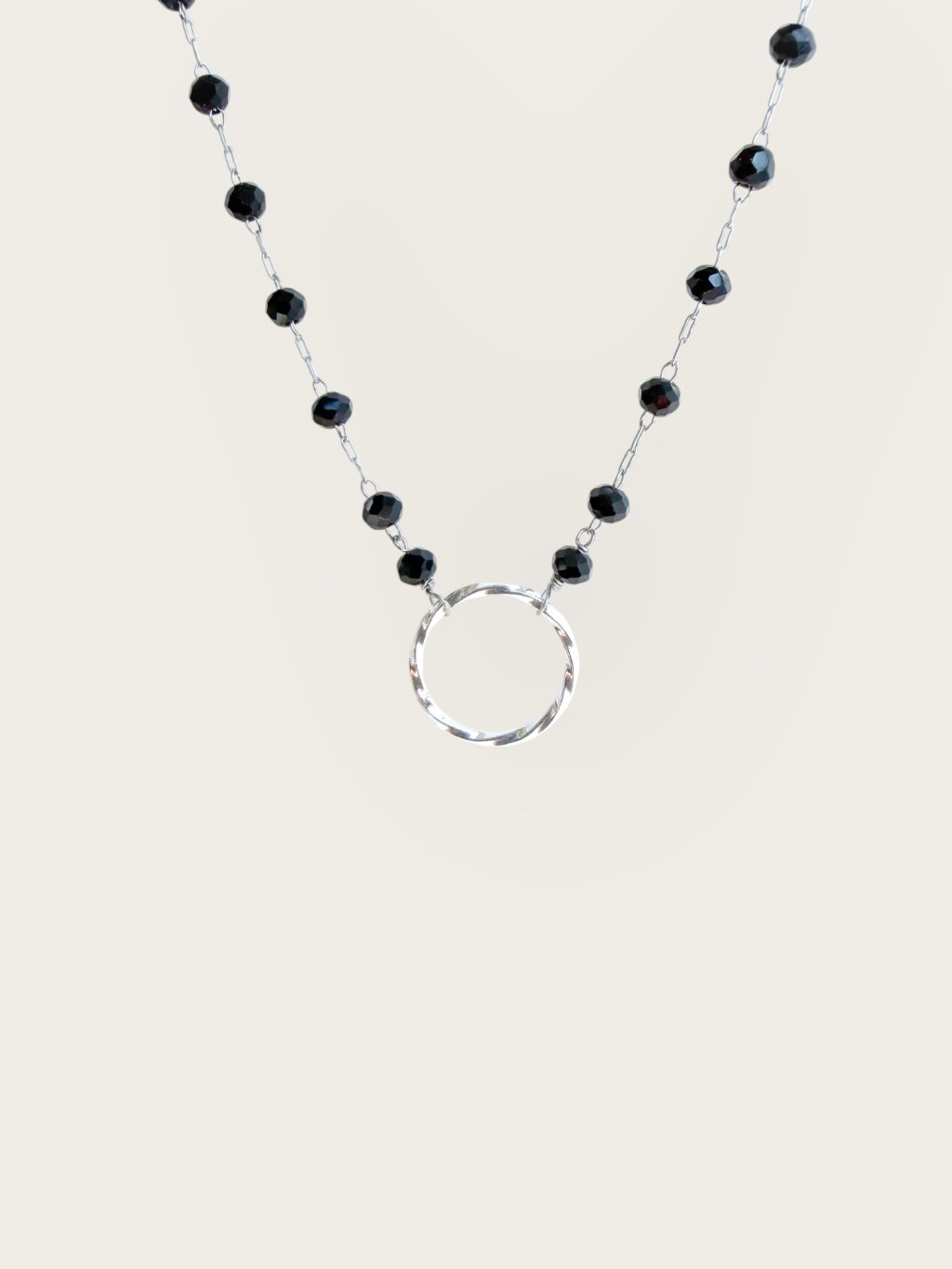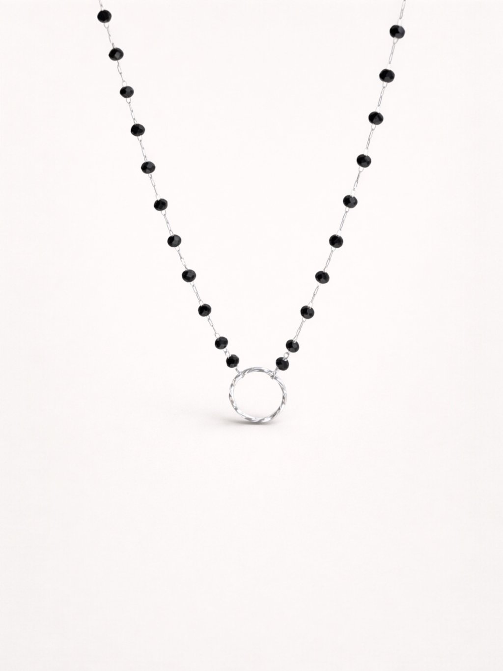 Kroucený kruh představuje rovnováhu a propojení, zatímco broušené korálky dodávají jemný lesk a originalitu.