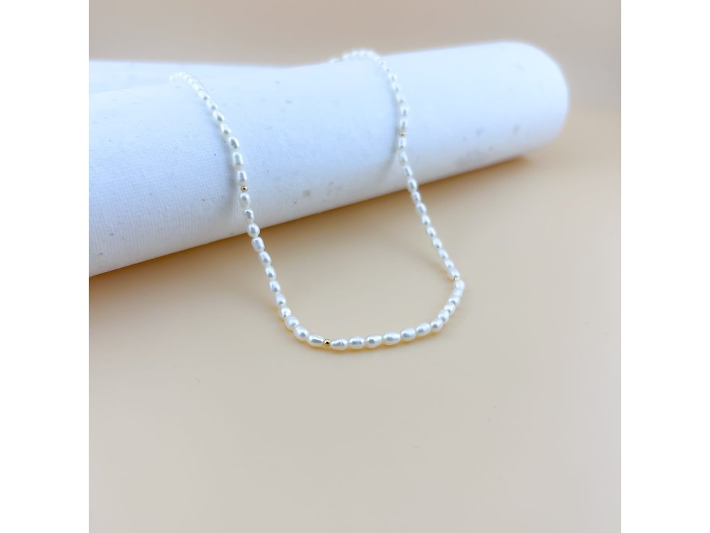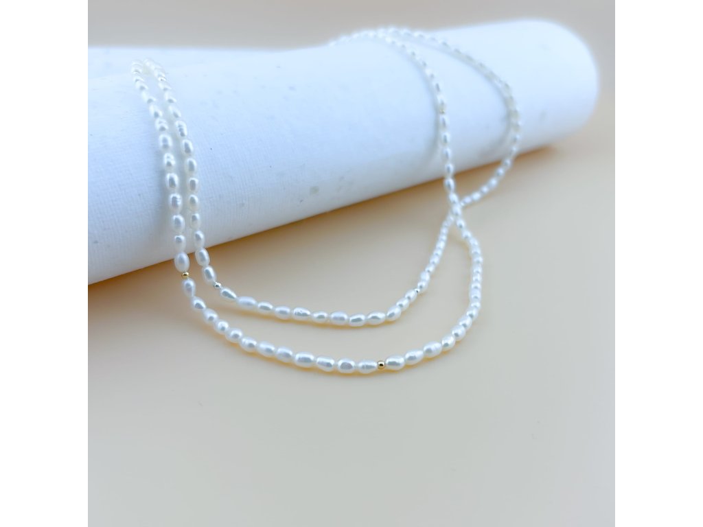Naše náhrdelníky jsou vyrobeny z pravých říčních perel, které jsou pečlivě vybírány pro svou jedinečnou krásu a kvalitu. Každá perla vyniká svou jemnou lesklostí a hladkostí, což zajišťuje, že váš náhrdelník bude vždy zářit. Perly jsou doplněny buď pozlacenými korálky, které dodávají jemný nádech luxusu, nebo robustními korálky z chirurgické oceli, jež zaručují dlouhověkost a odolnost.