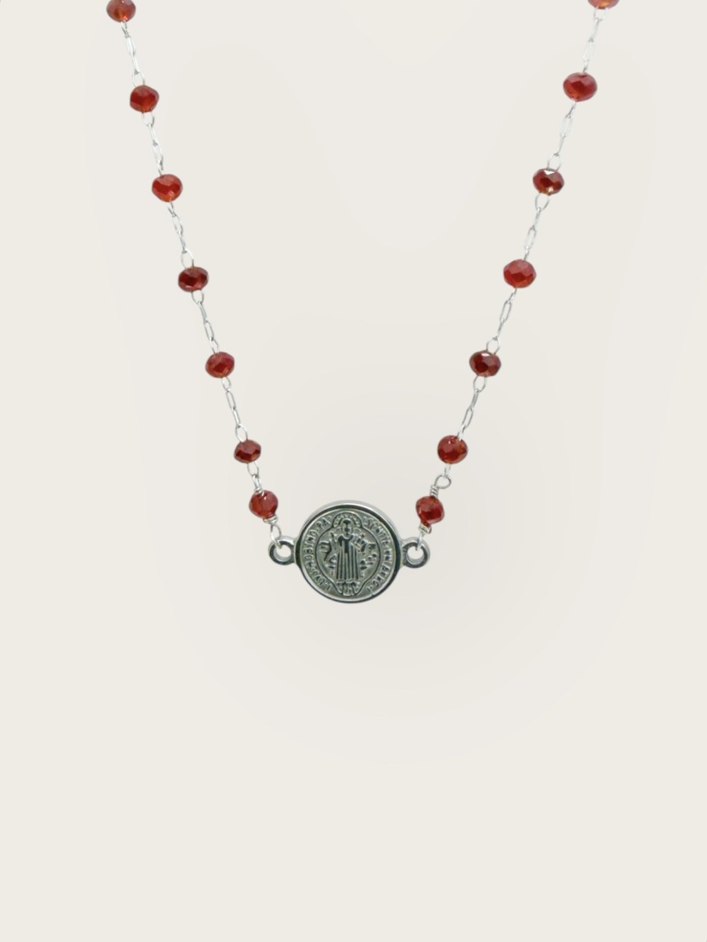 Dominantním prvkem náhrdelníku je medailon svatého Benedikta, který je tradičně považován za symbol ochrany, víry a duchovní síly. Jemné broušené korálky Ruby vytvářejí elegantní kontrast s kovem a dodávají šperku výrazný, ale stále velmi sofistikovaný vzhled.