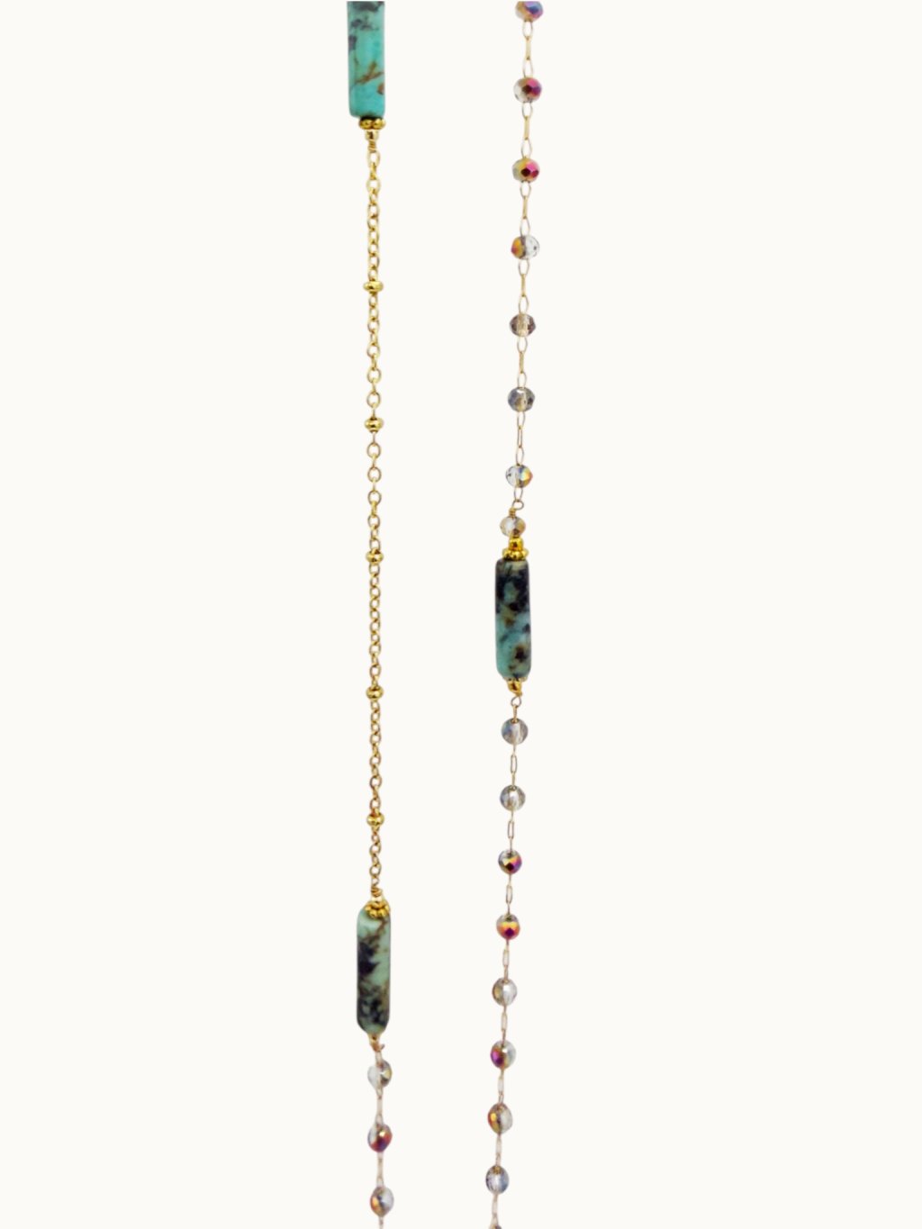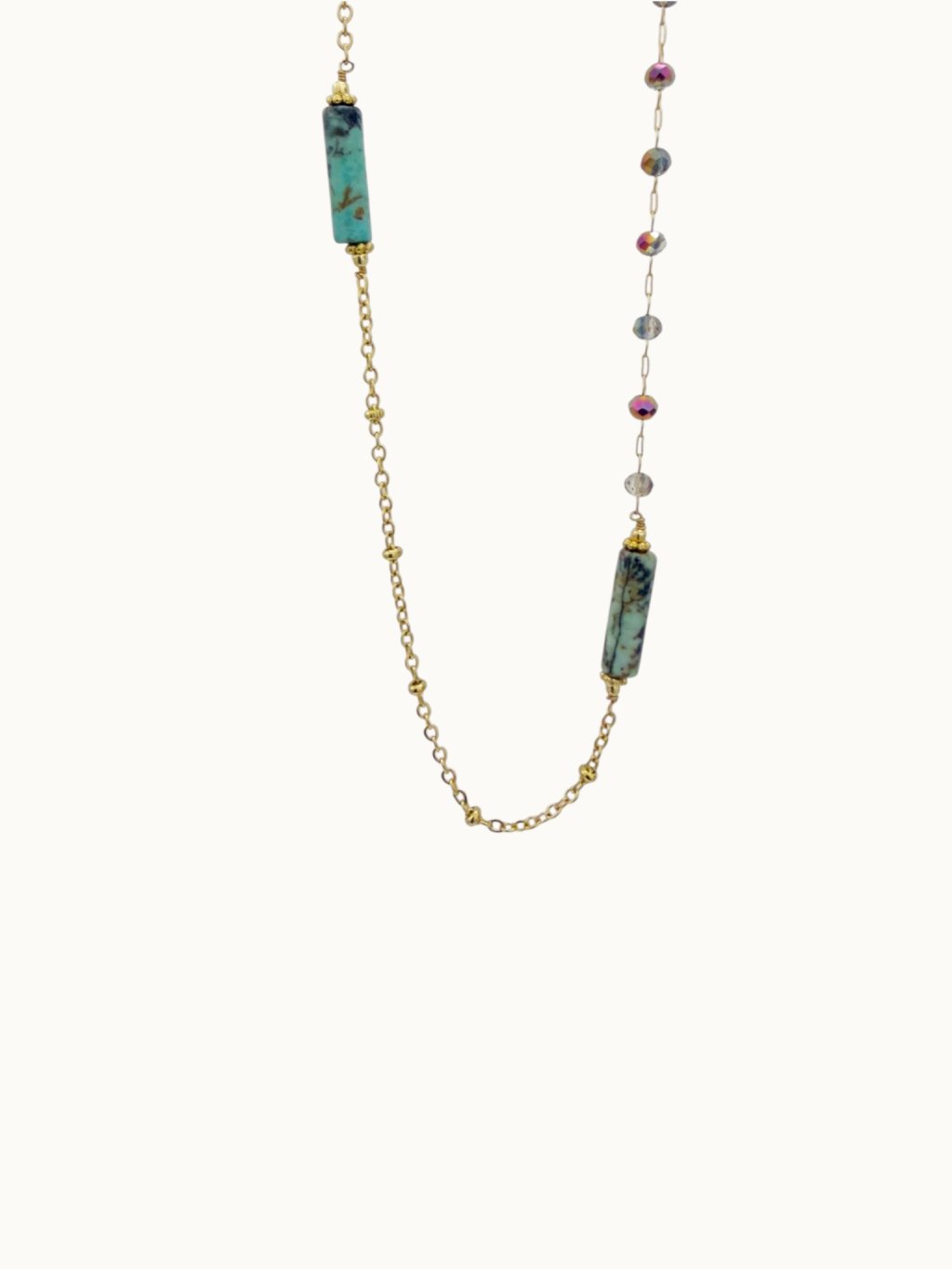 Tyrkys je kámen, který je po staletí spojován s harmonií, rovnováhou a vnitřní silou. V kombinaci s jemnými broušenými korálky s duhovým pokovem vzniká zajímavá hra světla a barev, která dodává náhrdelníku moderní charakter.