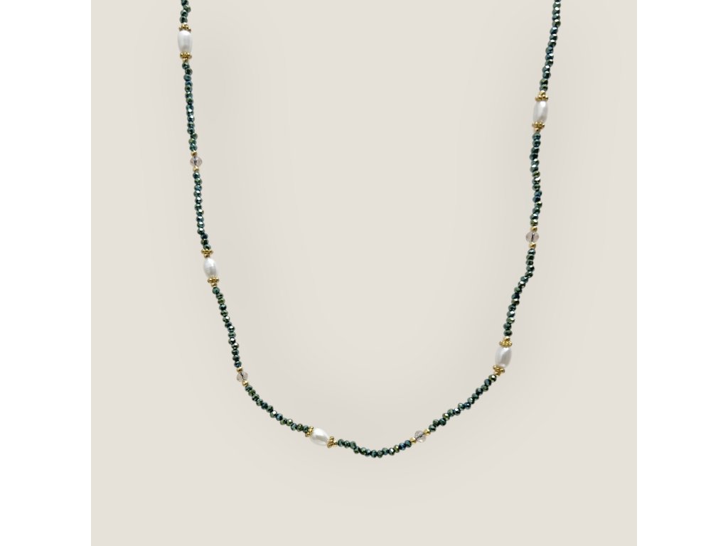 Náhrdelník s mini fazetovanými korálky v zelené barvě je něžným doplňkem, který rozzáří každý outfit. Drobné broušené korálky jemně odrážejí světlo a jsou doplněny o říční perly o velikosti 2–3 mm, které dodávají šperku přirozenou eleganci a nádech luxusu.
