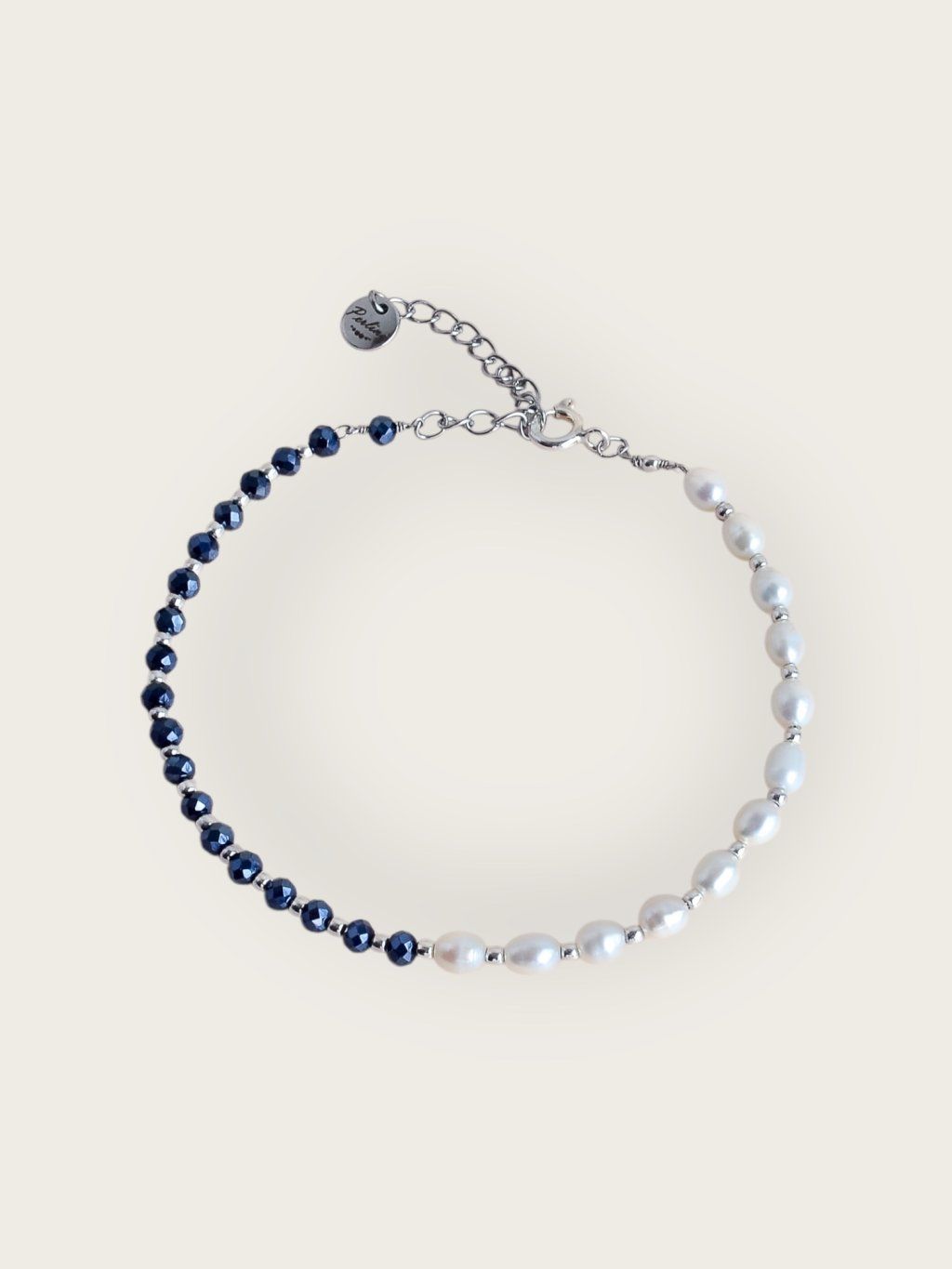 Náramek je ručně vyráběn v dílně PERLINA z kvalitních komponentů z chirurgické oceli. Dominantním prvkem jsou pravé říční perly, které doplňují broušené korálky v černé barvě s modrým pokovem. Každá perla je přírodní originál, a proto se může jemně lišit svým tvarem, velikostí i odleskem.