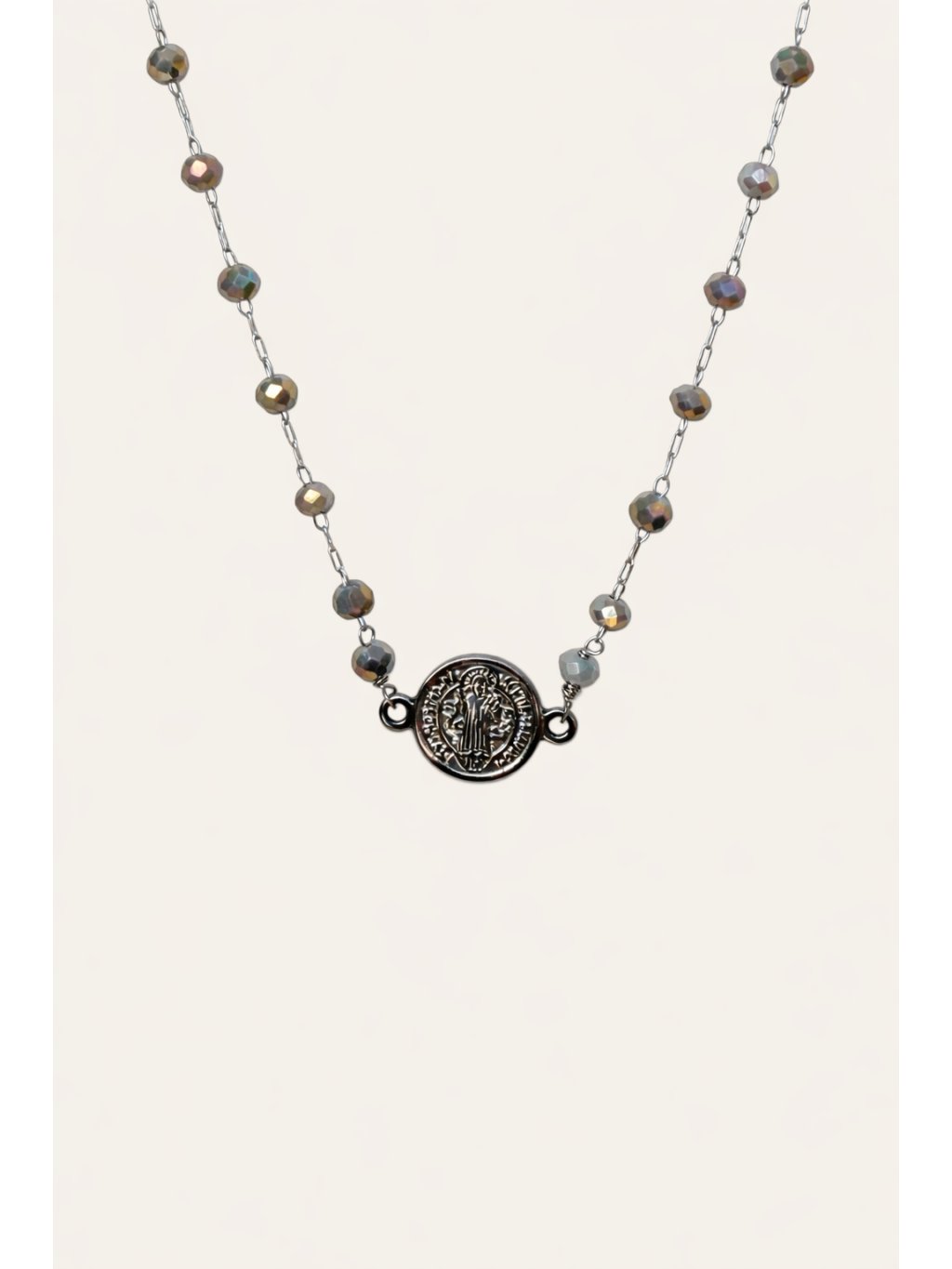 Elegantní řetízek s mincí sv. Benedikta a broušenými korálky v odstínu šedá s duhovým pokovem.