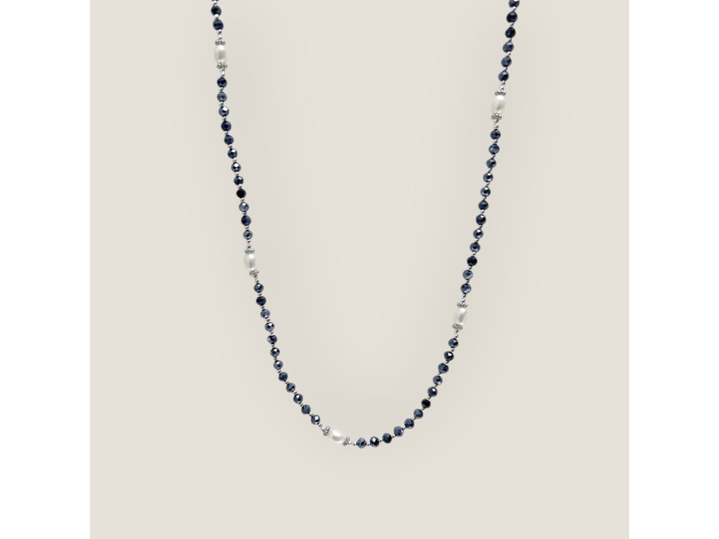 Jemné černé broušené korálky s modrým pokovem jsou navlečeny na krouceném hedvábí a prokládány drobnými mini korálky o velikosti 1,8 mm. Kombinace precizně broušených korálků a říčních perel o průměru 5–6 mm vytváří jedinečnou hru světla a kontrastů.