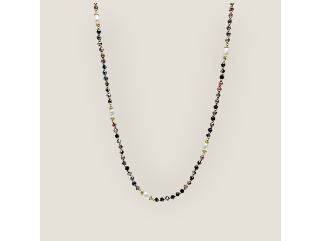 Jemné černé broušené korálky s duhovým pokovem jsou navlečeny na krouceném hedvábí a prokládány drobnými mini korálky o velikosti 1,8 mm. Kombinace precizně broušených korálků a říčních perel o průměru 5–6 mm vytváří jedinečnou hru světla a kontrastů.